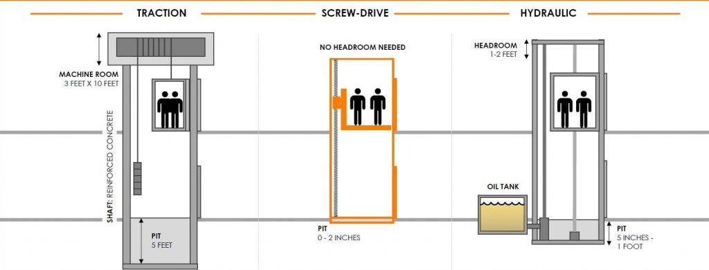For a traction lift, you would need a pit anywhere from 100 mm to 300 MM with an overhead machine room. Traction lift use counterweights on the side of the lift to move up and down. You must have seen an additional room at the top of a building where a traction elevator is installed, that special room is the machine room. Depending on the height of the building you can buy slower or faster speed lifts. The faster you go, the expensive it gets.